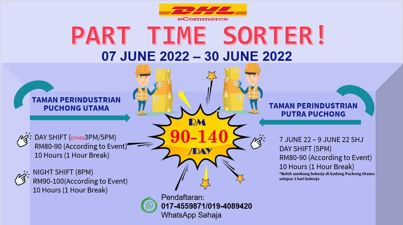 Start from part time and convert to full time for good performance worker. Kerja 4-5 hari seminggu. Jobs now available in Puchong.